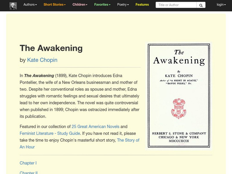A short synopsis of Kate Chopin's "The Awakening" followed by the full text divided by Chapter selection. With links to other short stories by American writers.
