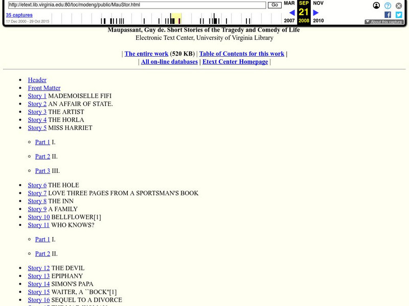 Maintained by the Electronic Text Center at the University of Virginia Library, this site offers the full text of Guy de Maupassant's "Short Stories of the Tragedy and Comedy of Life" which includes 27 short stories. Also provided are...