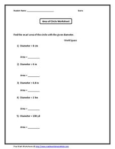 Given the diameter of a circle, learners are charged with finding its area. They halve the diameter, square it, and multiply by pi. Five problems provide basic practice.