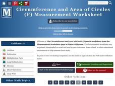 In this circumference and area worksheet, students find each for a set of 12 given circles; either diameter or radius are given. A website reference for additional resources and answers are provided.