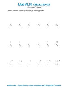 In this subtracting fractions worksheet, students solve 18 different problems that include subtracting various types of fractions. First, they find the least common multiple of both numbers. Then, students rewrite the fractions as...