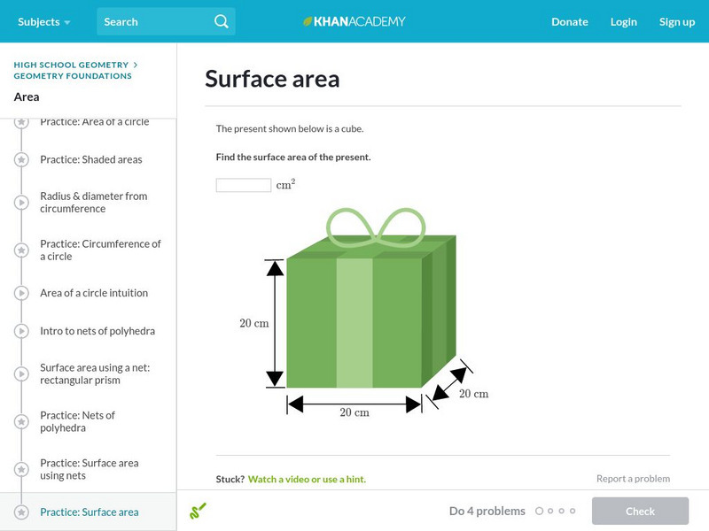 In this exercise, students practice finding the surface area of 3D objects. Students receive immediate feedback and have the opportunity to get hints and try questions repeatedly.
