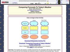 First graders compare forecasts to today's weather. They gather information about today's weather and record it on a chart. Students record information on the weather and discuss the importance of forecasts.