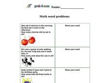 In this addition skills worksheet, students solve 3 math word problems that require them to add 1-digit numbers to 1-digit numbers.