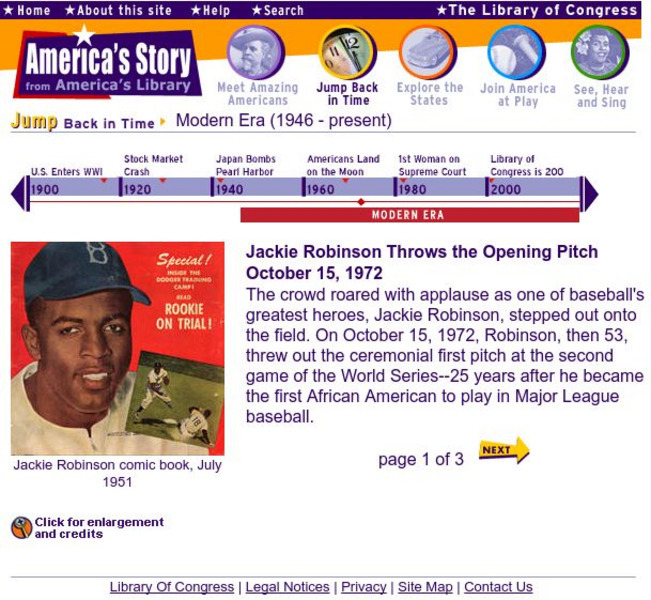 Jackie Robinson was not only one of the all-time great baseball players, he was the first African American to play in the Major Leagues. The Library of Congress presents a site with information and photographs of this amazing man.