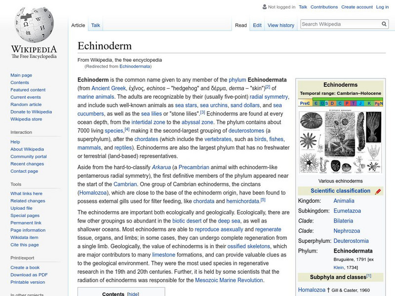 Wikipedia provides detailed information on echinoderms, or a phylum of marine animals including star fish and sea urchins. Website includes image, chart of scientific classification, and many hyperlinked terms.