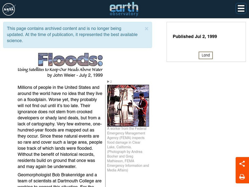 This article describes how scientists use satellite images to try and spot extreme floods. These satellites keep information stored, such as data on hundred-year floods, and try to identify likely flood plains based on that data.