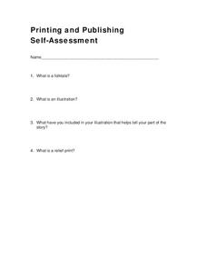 In this literacy learning exercise, students answer 4 short answer questions about illustration, folktales, and relief print. No answers are provided.