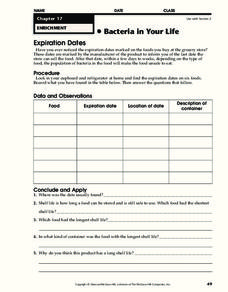 In this bacteria worksheet, students conduct an experiment by looking through their cupboard and refrigerator at home and locating the expiration date on six foods. Then they record what they found in the table shown. Students also...