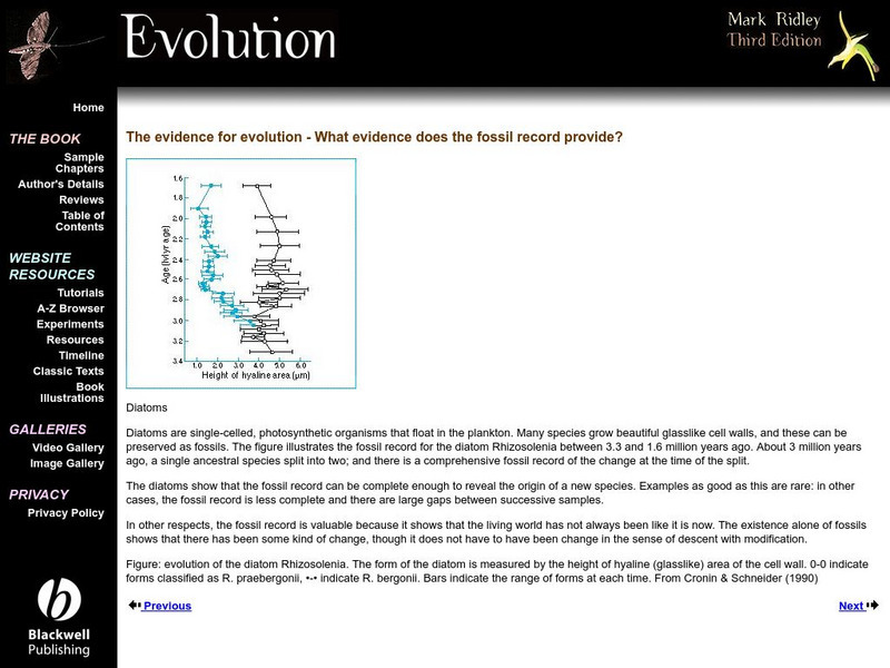 These pages are part of a site called "Evolution," that accompanies a textbook by the same name. Mark Ridley is the author. In this section he discusses how fossil records provide undeniable examples of evolutionary change.