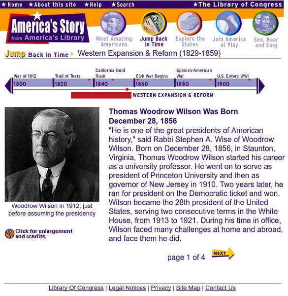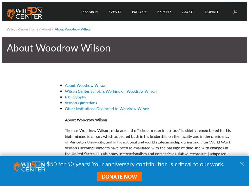 Provides complete background of Woodrow Wilson's life and accomplishments, as well as links to find out more information about his life.