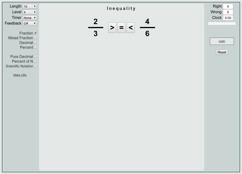 This resource allows users to test their knowledge of inequalities and using fractions.