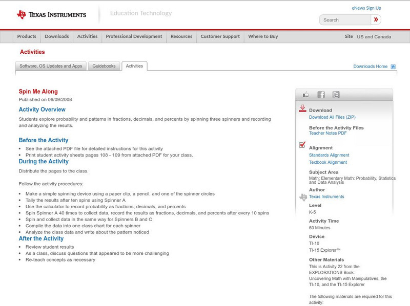 Students explore probability and patterns in fractions, decimals, and percents by spinning three spinners and recording and analyzing the results.