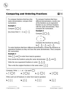 In this fractions worksheet, 4th graders compare four sets of fractions and place the greater or lesser sign between each set. Students write eight sets of fractions from the least to the greatest on the lines provided.
