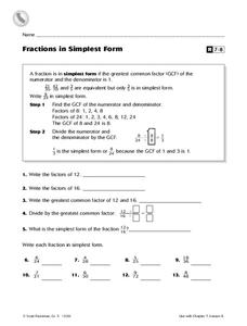 Put fractions in simpler terms. Learners watch a video showing how to simplifying fractions. They then work through two worksheets to practice the skill.