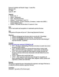 Students study fractions. In this equivalent fractions instructional activity, students utilize fraction strips to enhance their understanding of equivalent fractions. They watch a demonstration and then work independently with their own...