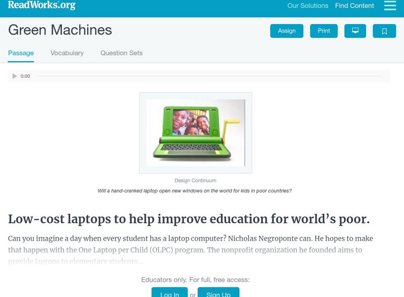 [Free Registration/Login Required] Students read about low-cost laptop computers improving education for children in need around the world. A question sheet is available to help students build skills in drawing conclusions.