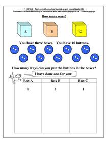 In this math puzzle worksheet, students are given 10 buttons on the page, and they are to arrange the buttons in the 3 boxes provided. Students fill in the chart to find out how many ways they can put the buttons in the boxes.