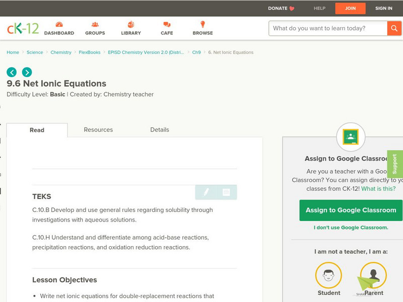 [Free Registration/Login may be required to access all resource tools.] Students write net ionic equations for double-replacement reactions that produce precipitates, gases, or molecular compounds, write net ionic equations for...