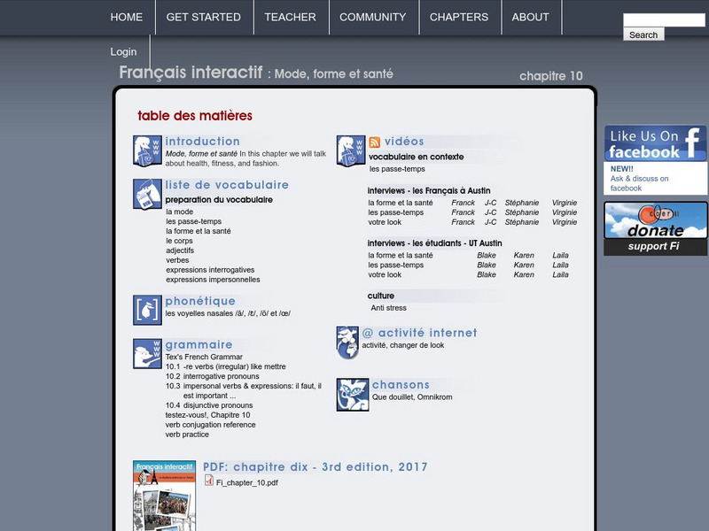 Extensive, interactive French culture site focuses on the body, fashion and health activities with video conversations--and includes grammar and other features for French learners.