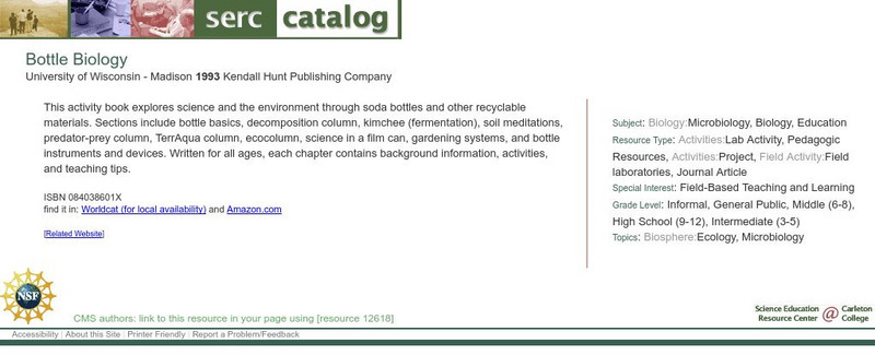 This activity book explores science and the environment through soda bottles and other recyclable materials. Sections include bottle basics, decomposition column, kimchee (fermentation), soil meditations, predator-prey column, TerrAqua...