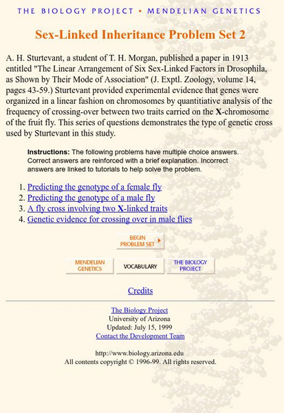 This site, provided by The University of Arizona, gives a good set of genetics problems that involve sex-linked genes. Great to review what you know! Links are provided to access the various subjects covered in this problem set.