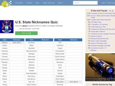 In this online interactive geography quiz worksheet, students examine the chart that includes the names of 49 states. Students identify the nicknames of the states in 6 minutes.