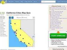 In this online interactive geography quiz worksheet, students examine the map that includes 12 California cities. Students identify the names of the cities in 3 minutes.