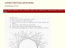 In this circles and parabolas activity, students follow directions to draw parabolas. They fold paper to represent a parabola. Students also use straight lines to create a circle. This one page activity contains three multi-step...