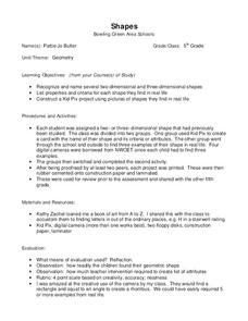 Fifth graders explore shapes. They recognize and name two-dimensional and three-dimensional shapes. Pupils discuss the properties and criteria for each shape they find in real life and construct a Kid Pix project using pictures of the...