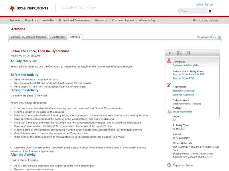 In this activity, students use the Geoboard to determine the length of the hypotenuse of a right triangles. [Requires Adobe Reader.]