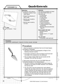 Students construct a variety of four-sided figures using a K'NEX Geometry Set. They view and discuss pictures of shapes, then in small groups they construct as many four-sided shapes as possible using the K'NEX Rods and Connectors. As a...