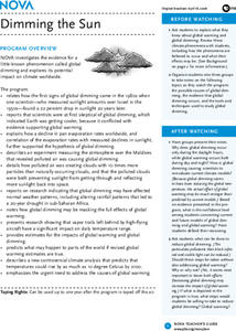 Students review the meanings of global warming and global dimming. While watching a video, they take notes on different aspects of the issue. In groups, they develop a list on what can be done to reduce global dimming. They...