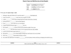For this online sentence completion worksheet, students read the sentences and complete them with the words expect, hope, or wait. Students complete 12 exercises.