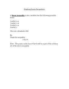 In this graphing linear inequalities activity, students graph 1 linear inequality. Students walk through each step to graphing the inequality and shading the appropriate region on the graph.