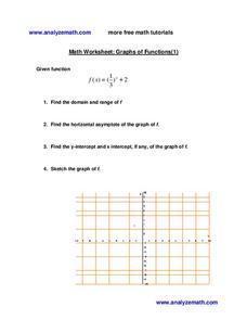 In this graphs of functions learning exercise, students identify the domain and range of a function. They determine the vertical horizontal asymptote and find the y and x intercepts. Students sketch a graph of the function. This one-page...