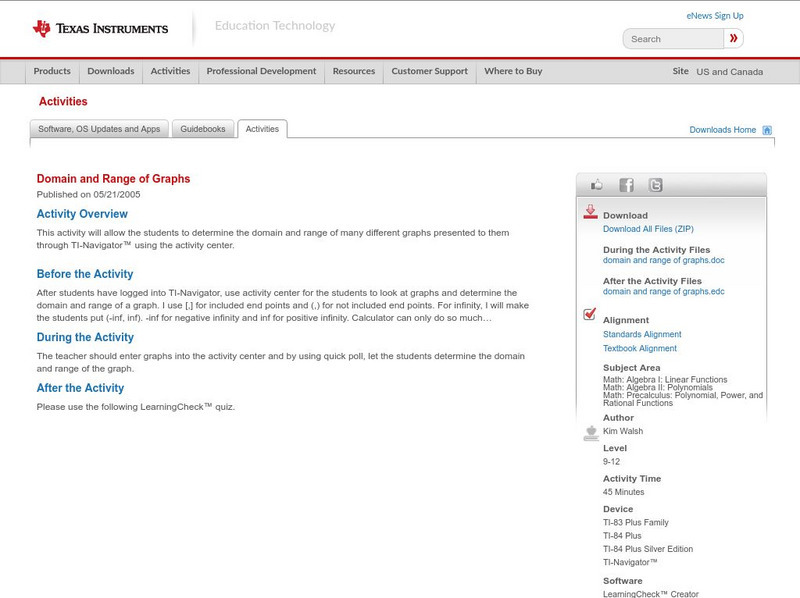 This activity will allow the students to determine the domain and range of many different graphs presented to them through TI-Navigator using the activity center.
