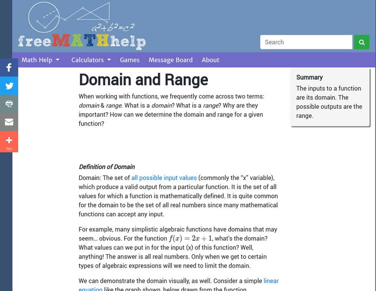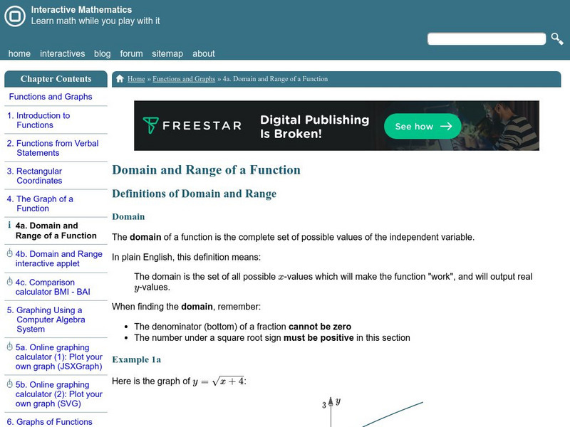 The Algebra session investigates domain and range. Students learn about the concept through definitions and sample exercises with graphs.