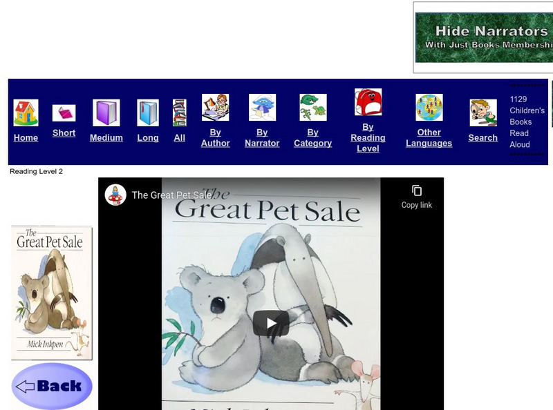 A video of the book "The Great Pet Sale", written by Mick Inkpen. Just Books Read Aloud is a site that includes children's books read aloud by normal (but enthusiastic) readers.