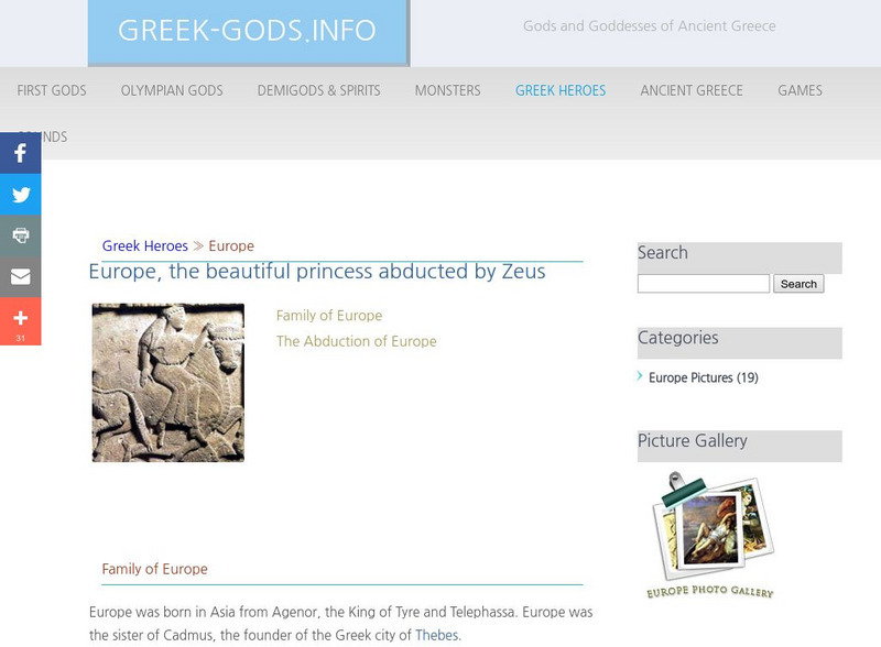Read about Europe, the Greek princess for whom the continent of Europe was named. Learn how she was abducted by Zeus in disguise.