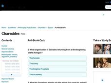 In this online interactive philosophy learning exercise, students respond to 25 multiple choice questions about Plato's Charmides. Students may check some of their answers on the interactive learning exercise.