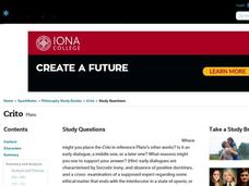 In this online interactive philosophy worksheet, students respond to 7 short answer and essay questions about Crito by Plato. Students may check some of their answers on the interactive worksheet.