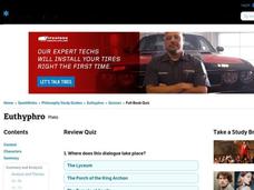 In this online interactive reading comprehension worksheet, students respond to 15 multiple choice questions about Plato's "Euthyphro," "Apology," "Crito," and "Phaedo." Students may submit their answers to be scored.