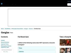 In this online interactive philosophy worksheet, students respond to 30 multiple choice questions about Gorgias by Plato. Students may submit their answers to be scored.