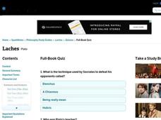 In this online interactive philosophy quiz instructional activity, students respond to 20 multiple choice questions about Plato's Laches. Students may submit their answers to be scored.