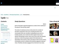 In this online interactive philosophy worksheet, students respond to 10 short answer questions about Lysis by Plato. Students may check some of their answers on the interactive worksheet.