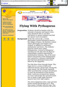 A lengthy narrative about Pythagoras and his students precedes an activity in which your young mathematicians practice using the Pythagorean theorem to solve three problems about flight and distance. Answers are provided.