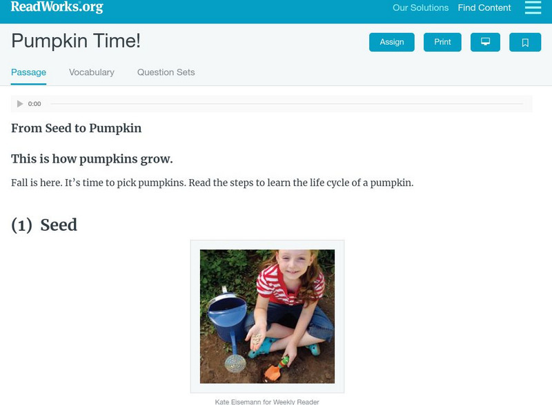 [Free Registration/Login Required] An informational text about how a seed grows into a pumpkin. A question sheet is available to help students build skills in reading comprehension.
