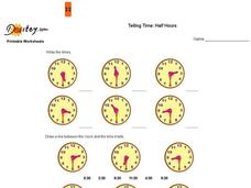 In this telling time worksheet, students solve 8 problems in which the time on a clock is written to the nearest half hour. Students also draw the minute hand on clocks to match the digital times.
