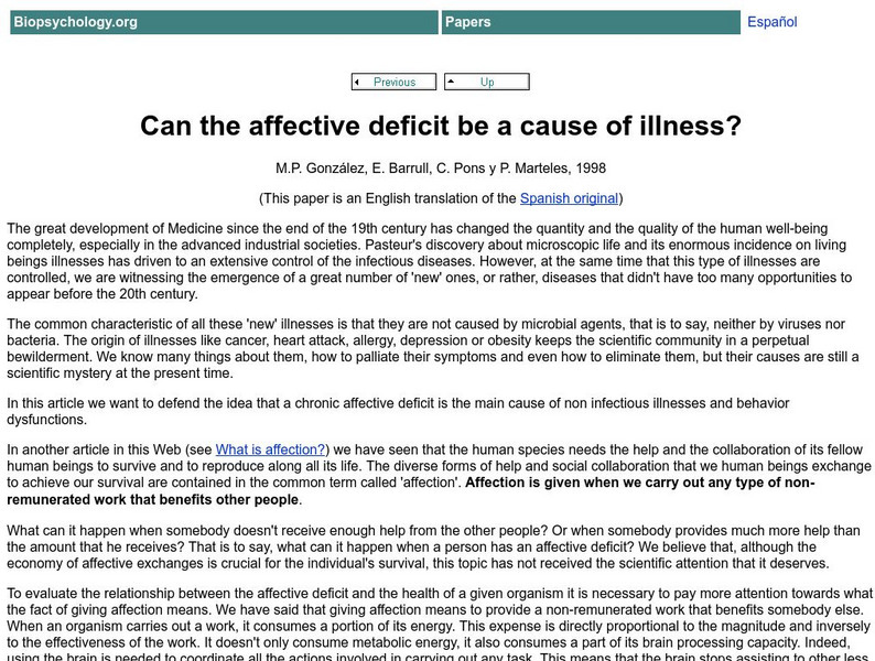 Scholarly paper giving a comprehensivewe defense of the idea that a chronic affective deficit is the main cause of non-infectious illnesses and behavior dysfunctions. The authors believe that this is an example of how Biopsychology can...